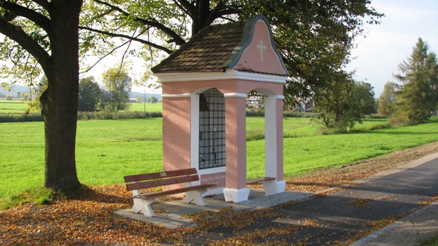 Mühlenkapelle mit neuer Sitzbank, Kapelle renoviert und Bank vom Volkssportverein Oberroth (1. Vors. Anton Mößmer und Josef Tochtermann)